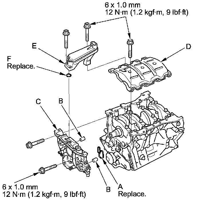 37. Install the baffle plate (D), then install the oil strainer (E) with the new O-ring (F).