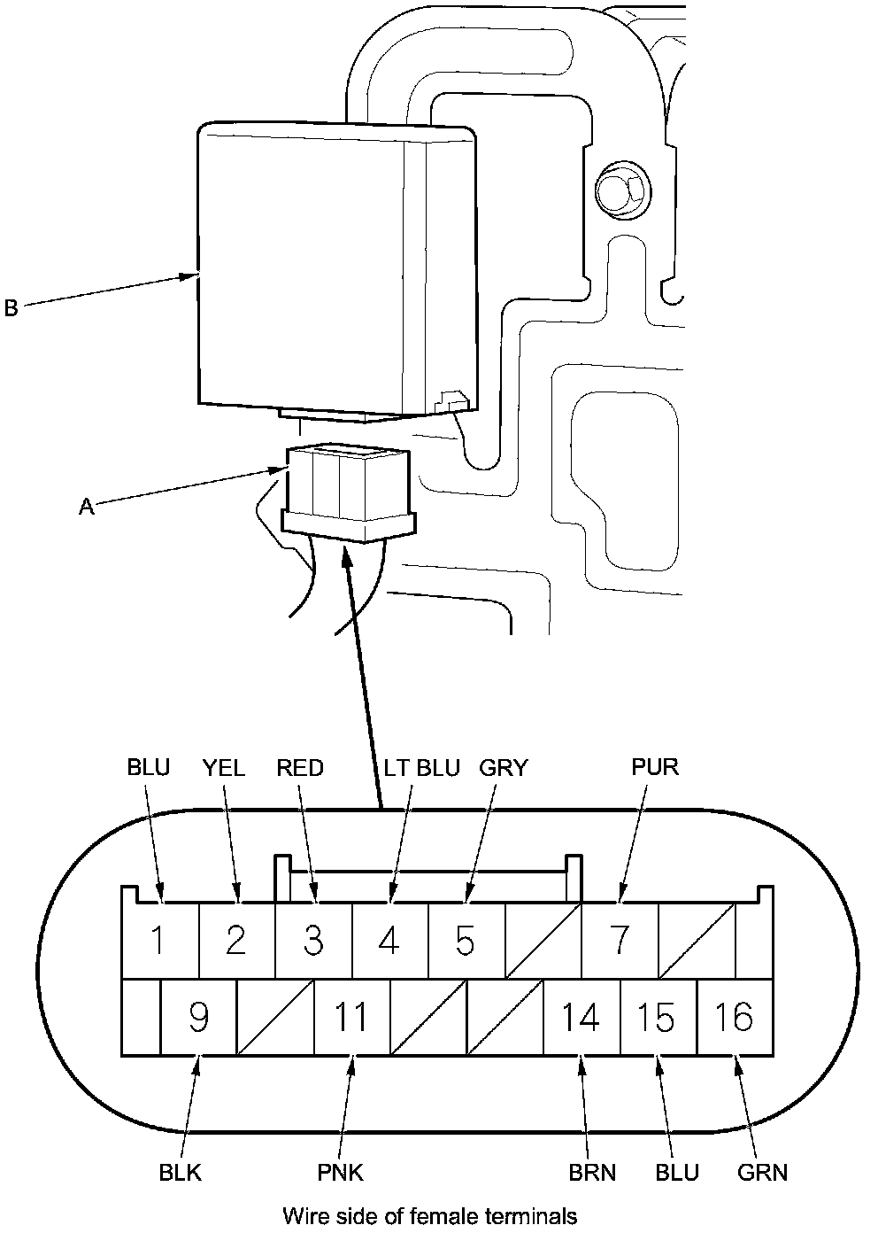 3. Disconnect the 16P connector (A) from the headlight leveling control unit (B).