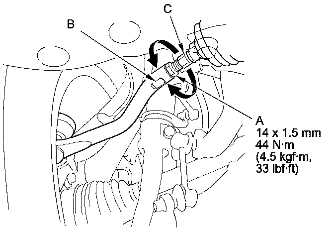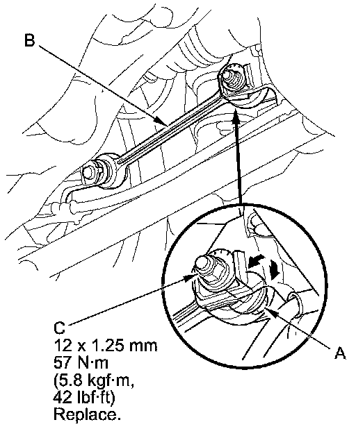 3. Hold the adjusting bolt (A) on the rear control arm (B), and loosen the self-locking nut (C).