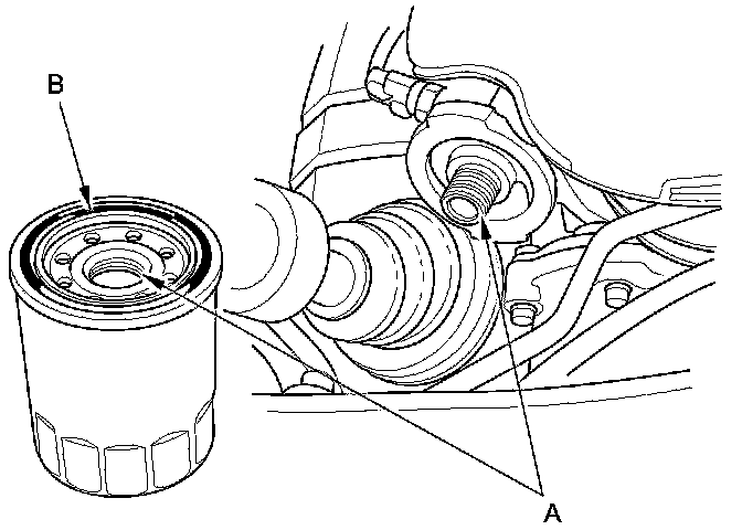 3. Inspect the threads (A) and the rubber seal (B) on the new filter. Clean the seat on the engine block, then apply a light coat of new engine oil to the oil filter rubber seal. Use only filters with a built-in bypass system.