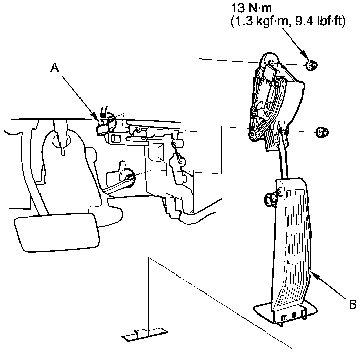 2. Release the lock tab on the base of the accelerator pedal, then remove the accelerator pedal module (B).