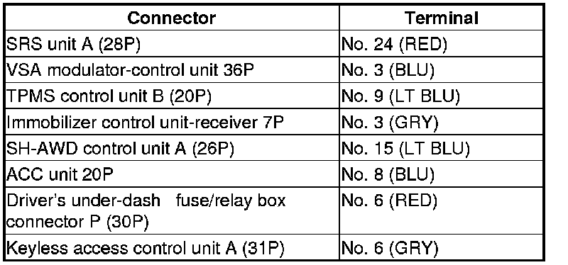 Repair a short in the wire between DLC terminal No. 7 (K-LINE) and the VSA modulator-control unit, the SRS unit, the TPMS control unit, the immobilizer control unit-receiver, the SH-AWD control unit, the ACC unit, and the driver's under-dash fuse/relay box, or between DLC terminal No. 1 (DIAG-H line) and the immobilizer control unit-receiver, or the keyless access control unit.�