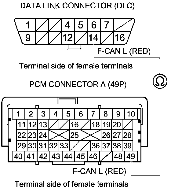 35. Check for continuity between PCM connector terminal A49 and DLC terminal No. 14.
