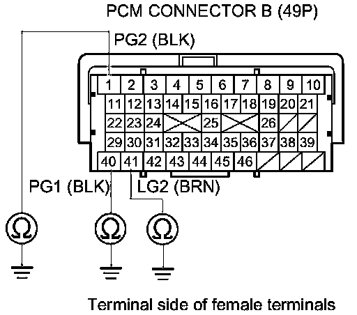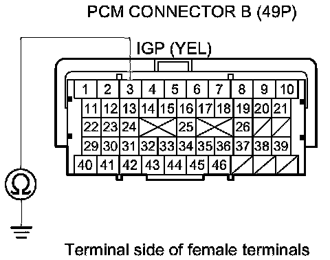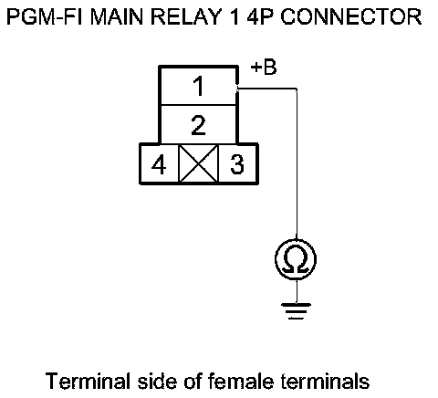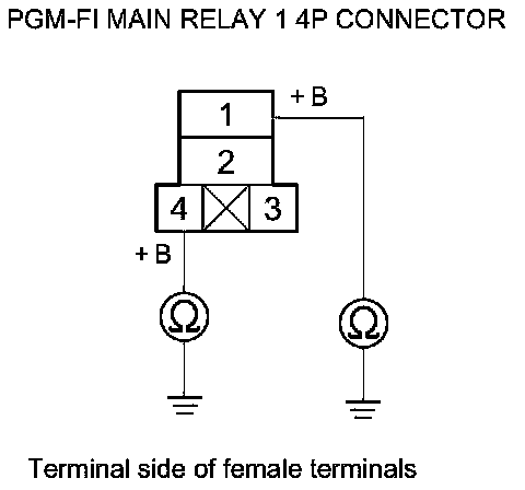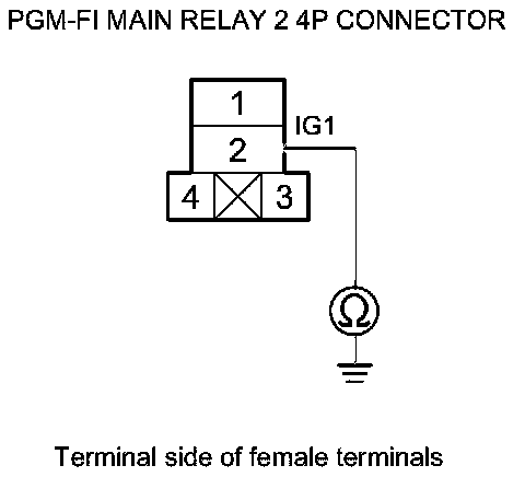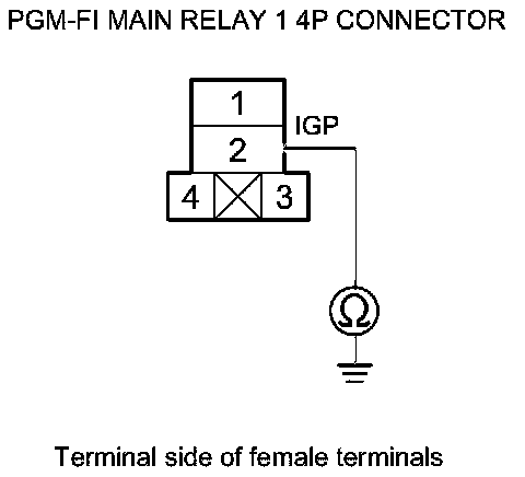 46. Check for continuity between body ground and PGM-FI main relay 1 4P connector terminals No. 1 and No. 4 individually.