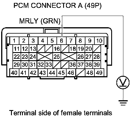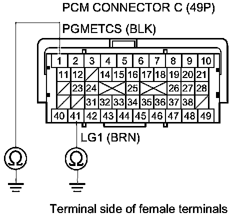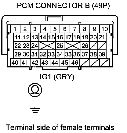 49. Check for continuity between PGM-FI main relay 1 4P connector terminal No. 2 and body ground.