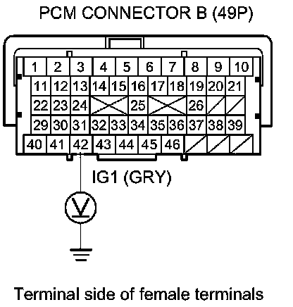 63. Measure the voltage between PCM connector terminal B42 and body ground.