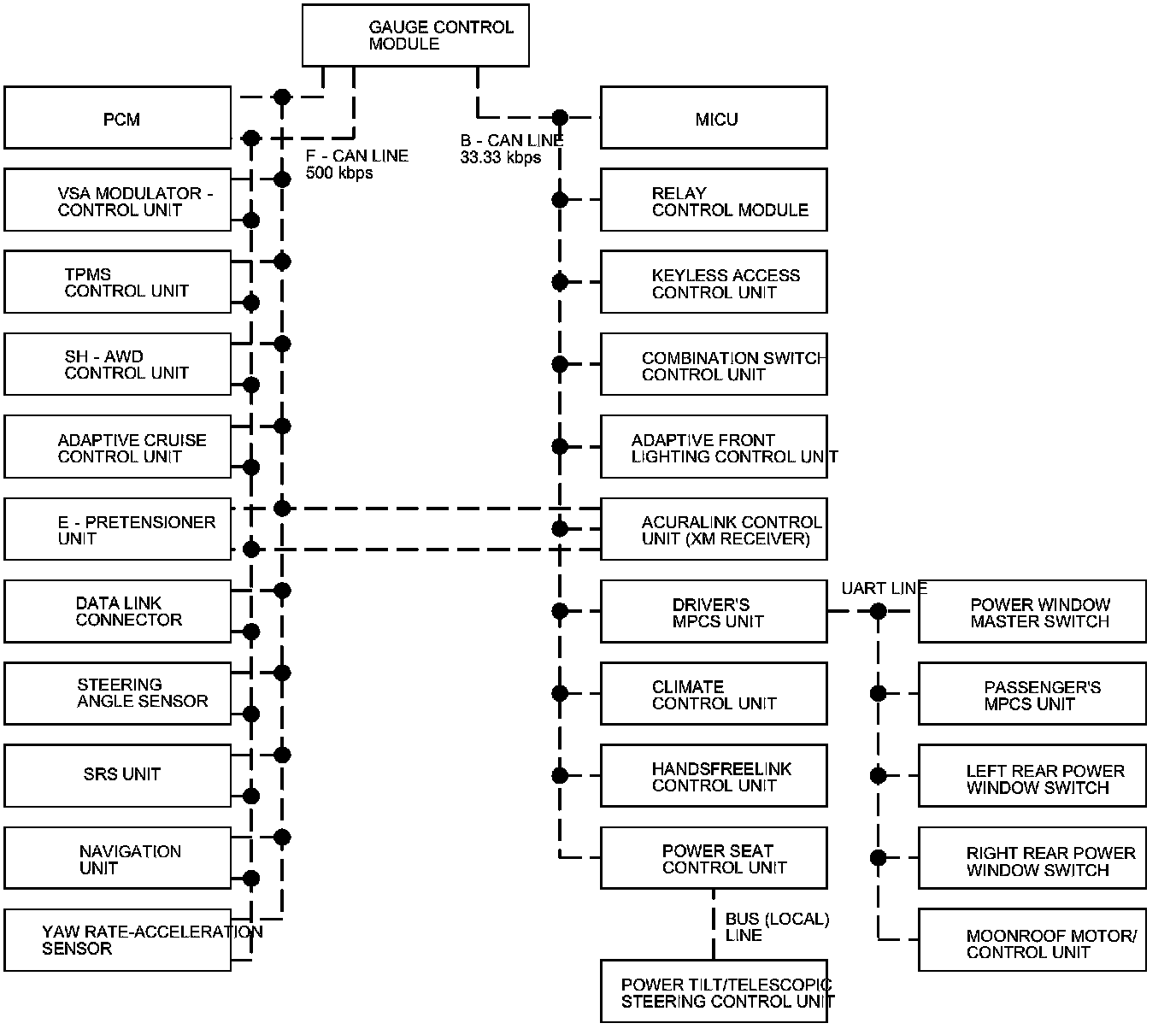 The fast controller area network (F-CAN) and the body controller area network (B-CAN) share information between multiple electronic control units (ECUs). B-CAN communication moves at a slower speed for convenience related items and for other functions. F-CAN information moves at a faster speed for "real time" functions such as fuel and emissions data. To allow both systems to share information, the gauge control module translates and relays the information from the B-CAN to the F-CAN and from the F-CAN to the B-CAN. This is called the Gateway Function.