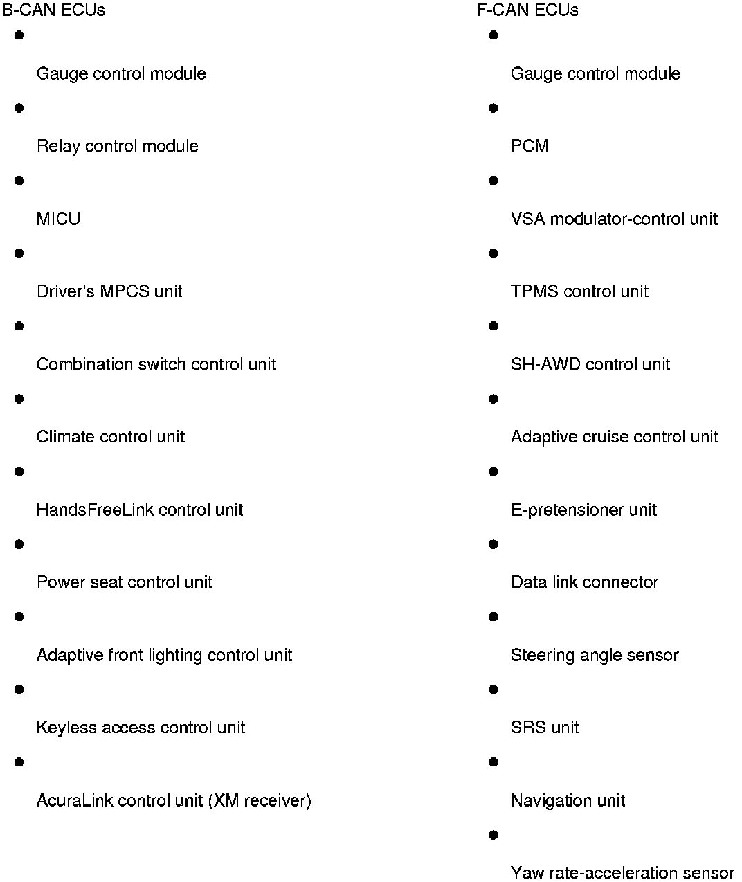 Several ECUs are connected to each of the two networks. The gauge control module is part of both networks since it is the "gateway" between them. Here is a list of ECUs and the network they are connected to.