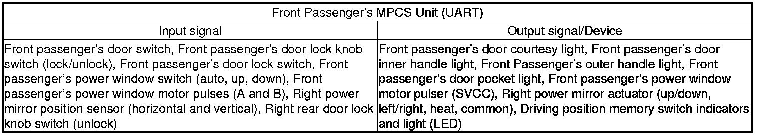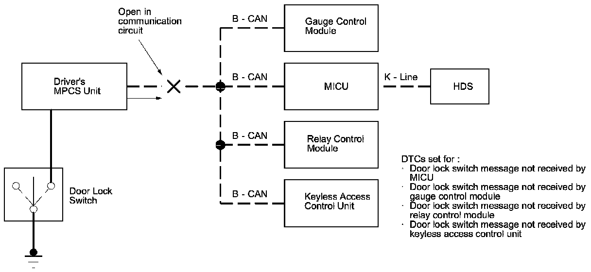 Since there is a break in the communication circuit, the door lock switch message could not be received by the MICU, the relay control module, the gauge control module, or the keyless access control unit. Each of these units will set "loss of communication" error codes for the message(s) they did not receive. There may be multiple communication DTCs if the unit that has become disconnected from the network would normally transmit multiple messages during the communication line test. For example, the driver's MPCS unit sends the door switch message and door lock switch message during the communication circuit test.