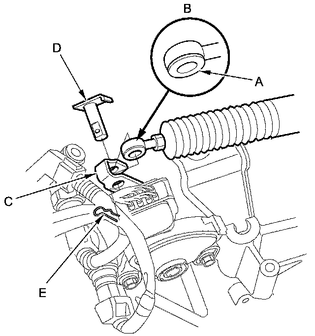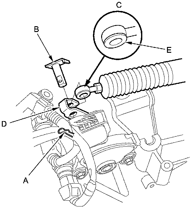 5. Check the bushing (E) in the shift cable end for a proper fit and wear. If the bushing is loose or worn, replace the shift cable Service and Repair.