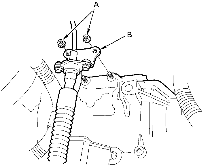 6. Remove the nuts (A) securing the shift cable bracket (B).