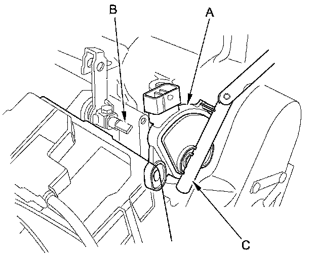 10. Install the transmission range switch (A) gently on the selector control shaft (B) while holding it in the N position with the 2.0 mm (0.08 in) blade (C).
