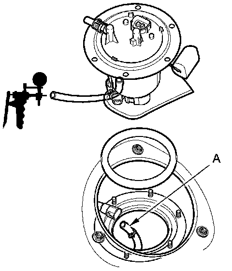 2. Disconnect the transfer tube (A), then connect a vacuum pump/gauge, 0-30 inHg, to the fuel tank unit.