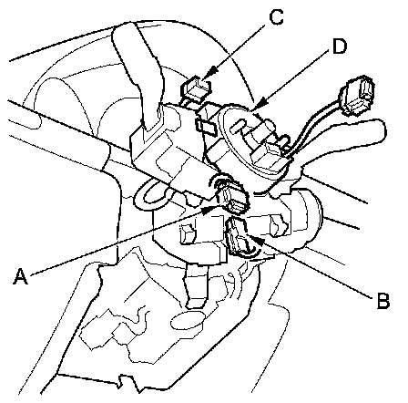 8. Disconnect the dashboard wire harness 4P connector (A) from the cable reel 4P connector (B), then disconnect the dashboard wire harness 20P connector (C) from the cable reel (D).