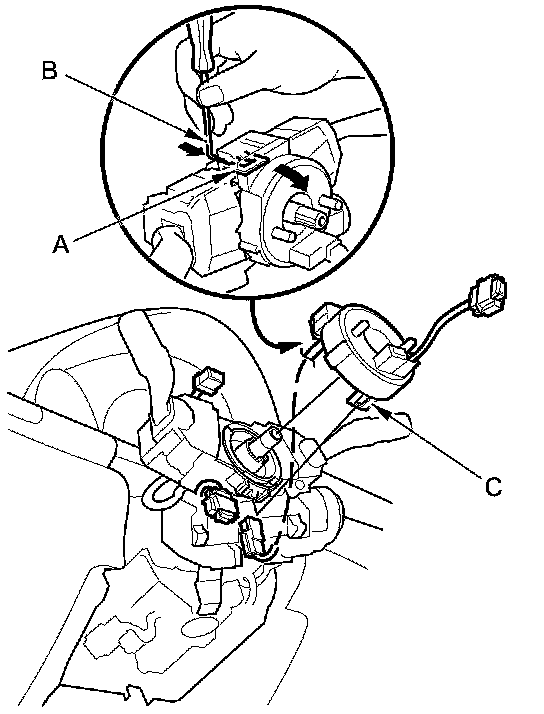 9. Release the upper lock tab (A) under the cable reel connector with a 90 ° hook shaped tool (B). Slide the tool below the cable reel connector just above the lock tab. Release the lower lock tab (C), and slide the cable reel off the column.