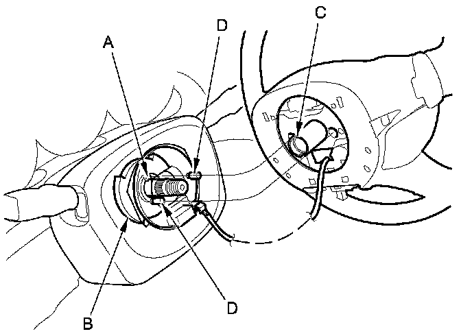 7. Position the two tabs (A) of the turn signal canceling sleeve (B) as shown, and install the steering wheel on the steering column shaft, making sure the steering wheel hub (C) engages the pins (D) of the cable reel and tabs of the turn signal canceling sleeve. Do not tap on the steering wheel or steering column shaft when installing the steering wheel.