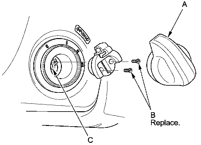 1. Remove the ignition switch knob (A). Then remove the two screws (B) and lower knob portion from the ignition key cylinder (C).