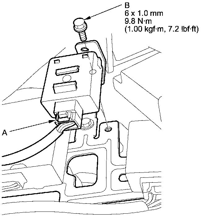 2. Disconnect the connector (A) from the ECPS control unit, and remove the bolt (B).