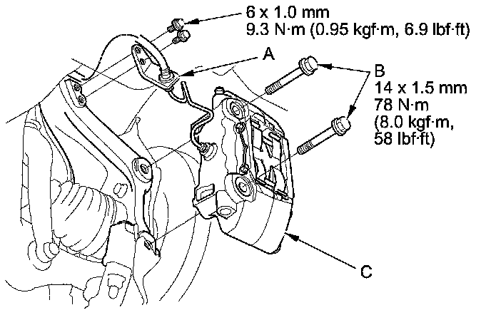 4. Remove the brake caliper bracket mounting bolts (B), and remove the caliper assembly (C) from the knuckle. To prevent damage to the caliper assembly or the brake hose, use a short piece of wire to hang the caliper assembly from the undercarriage. Do not twist the brake hose excessively.