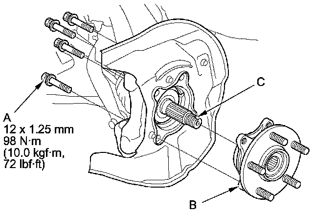 9. Remove the hub bearing unit (B) by tapping the driveshaft end (C) with a soft face hammer while drawing the hub bearing unit outward.