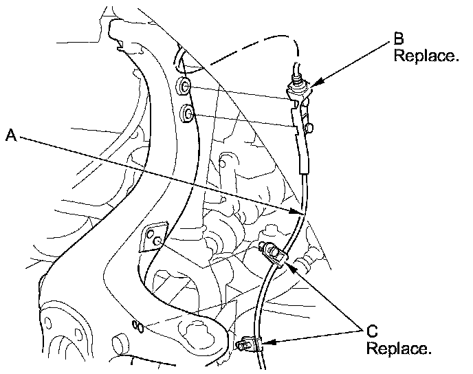 NOTE: Use a new wheel speed sensor bracket (B) and new clips (C) during reassembly.