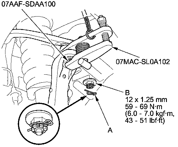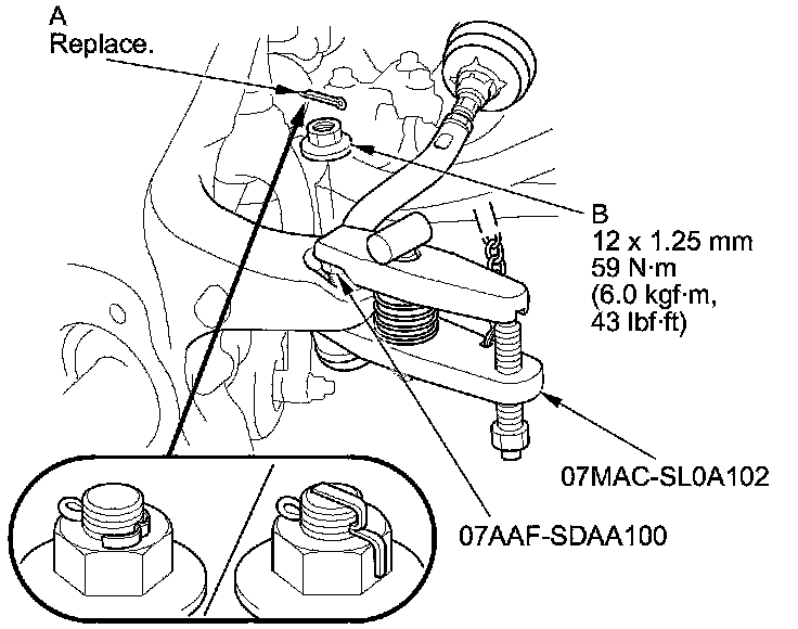 7. Remove the lock pin (A) from the upper arm ball joint, then remove the castle nut (B).