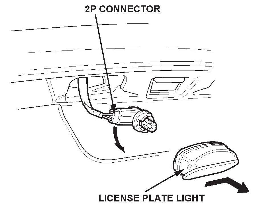 6. Disconnect the 2P connectors from both license plate lights, then remove the lights.