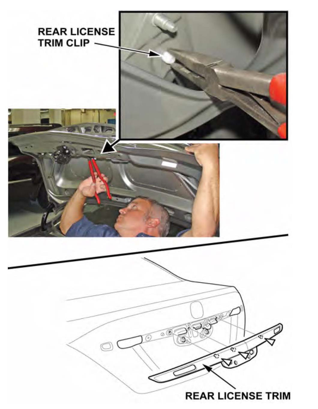 8. From inside the trunk, squeeze the backside of the rear license trim clips with needle nose pliers, then remove the trim from the trunk lid.