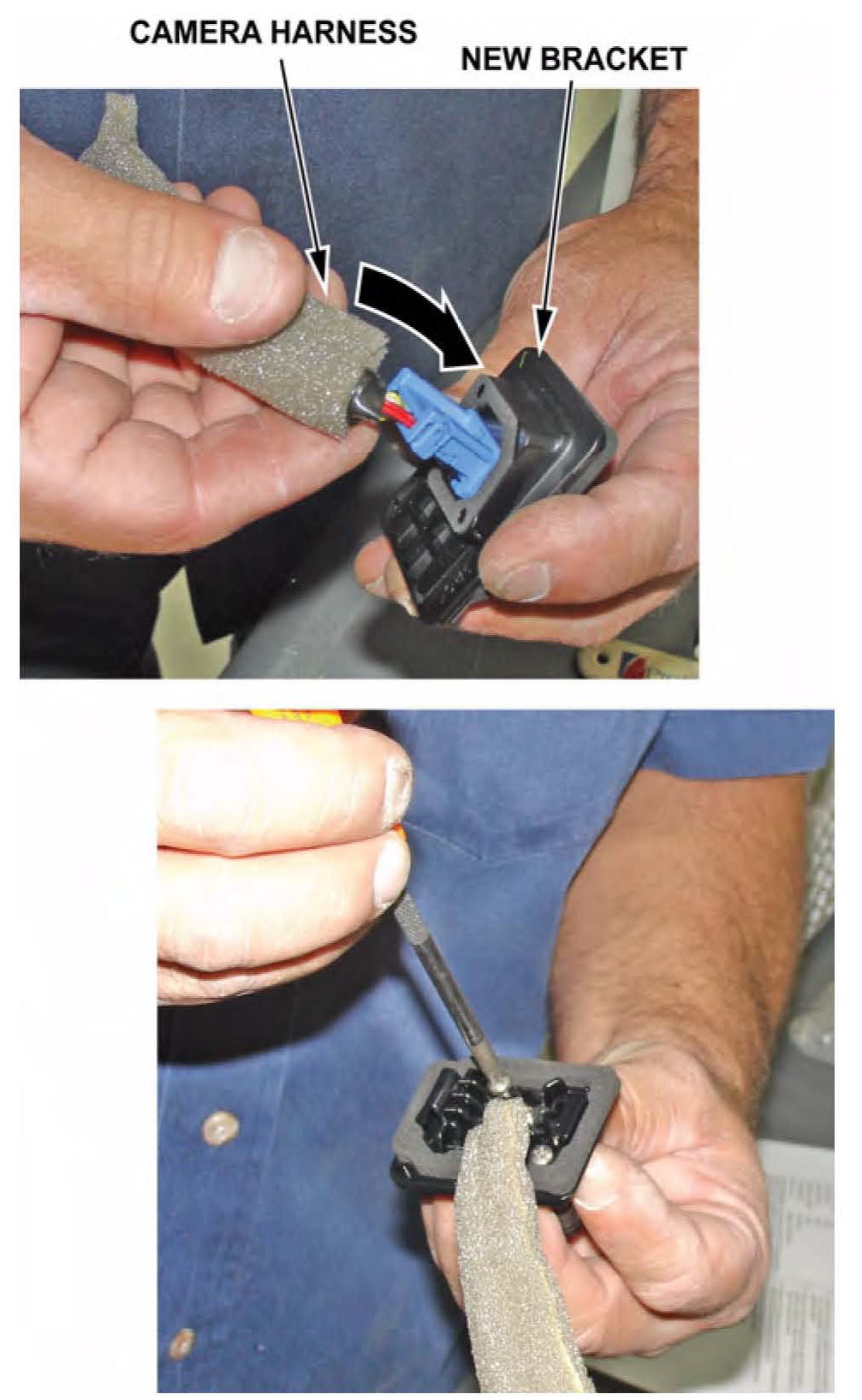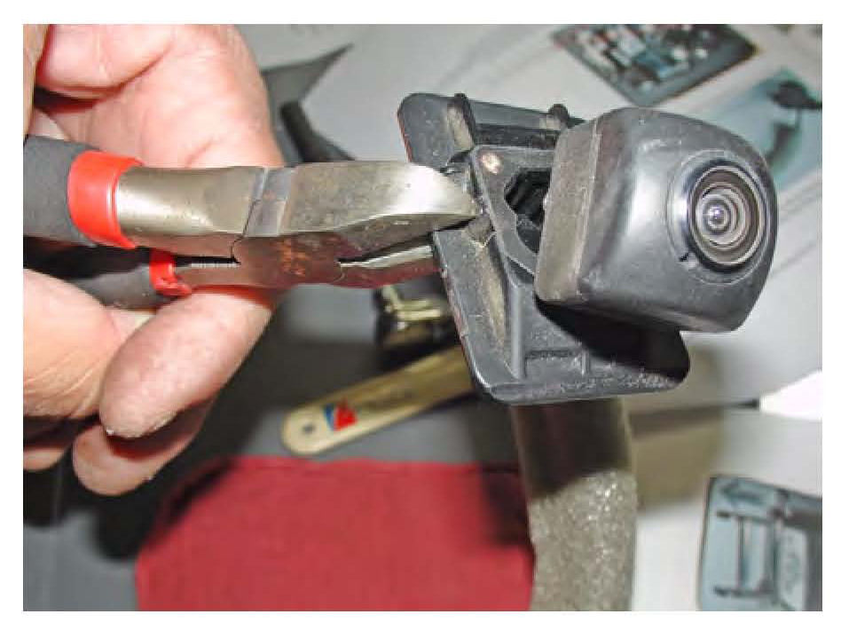 12. Using side-cutters, cut the old camera bracket in half to remove it from the camera harness.
