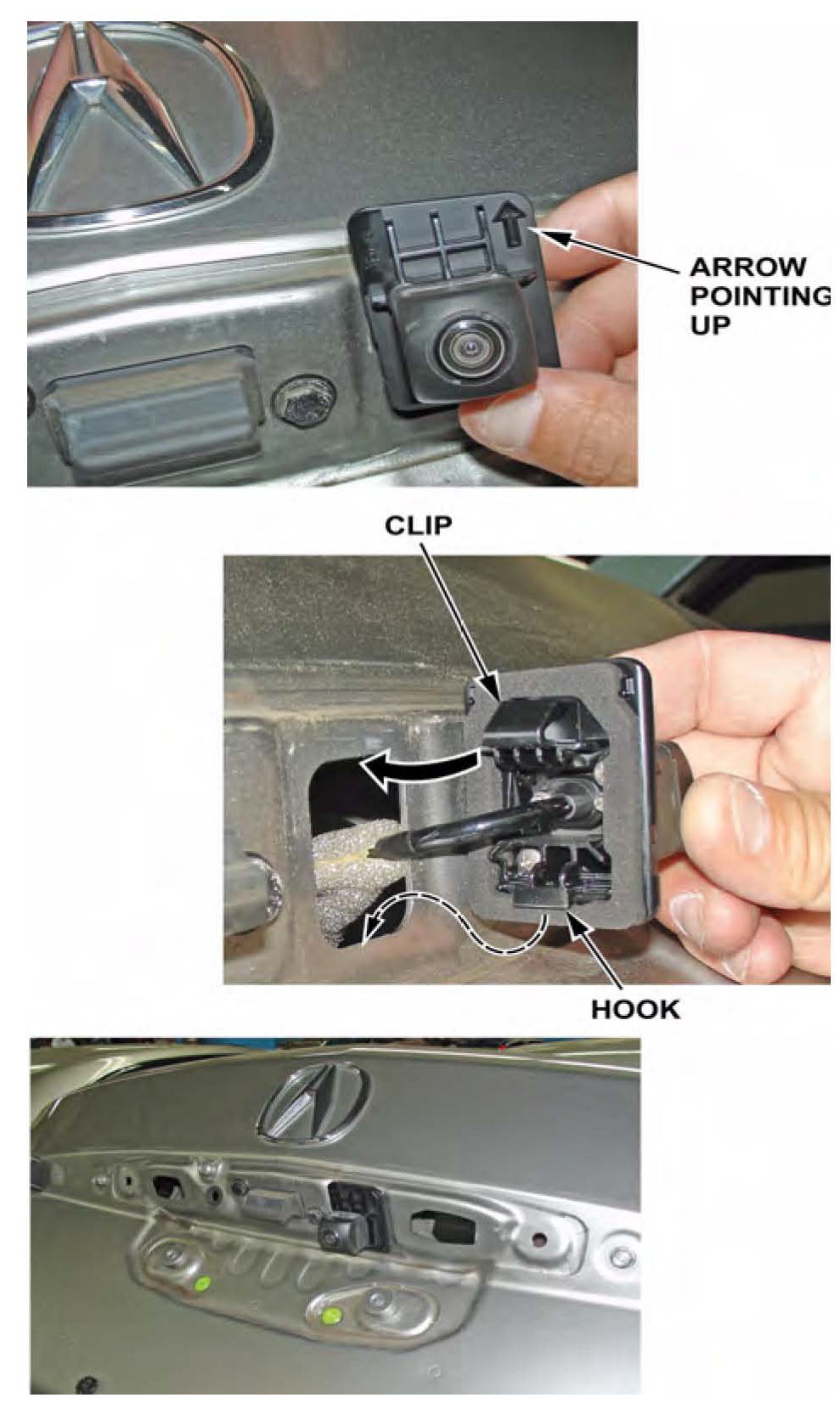 15. Reinstall the rearview camera with the arrow on the bracket pointing up. Firmly seat the bracket (bottom first) in the trunk lid hole, then gently snap in the top of the bracket.