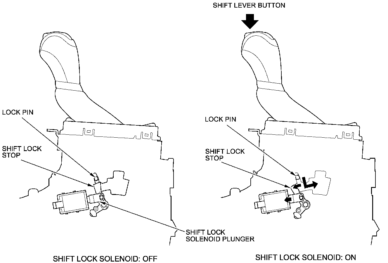 The shift lock system prevents the shift lever from moving unless certain conditions are met. The shift lock solenoid is normally OFF. After starting the engine in P, the shift lock stop prevents the shift lever from moving to any other position from P. When the brake pedal is pressed and the accelerator pedal is not pressed, the PCM commands the shift lock solenoid is ON; the shift lock solenoid plunger in the shift lock solenoid pulls the shift lock stop to release the lock pin. Pressing the shift lever button allows the shift lever to move to any other position. When the brake pedal and the accelerator pedal are pressed at the same time, the PCM commands the shift lock solenoid OFF and the shift lock system is locked.