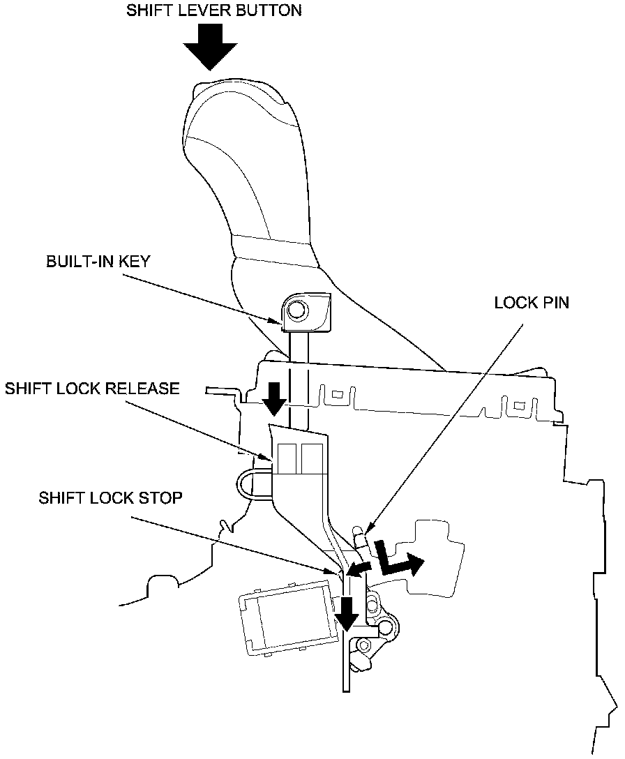 When the shift lock system does not operate due to mechanical or electrical problem, you can unlock the shift lock temporarily by inserting the built-in key into the shift lock release hole and pressing the shift lock release. When the shift lock release is pressed, the shift lock stop releases the lock pin, and the shift lever can move to any other position.