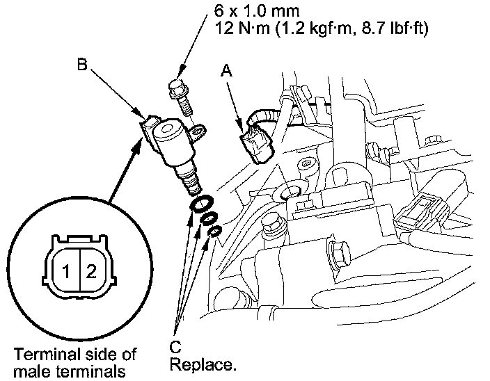 8. Disconnect the shift solenoid valve C connector (A), and remove shift solenoid valve C (B) with the O-rings (C).