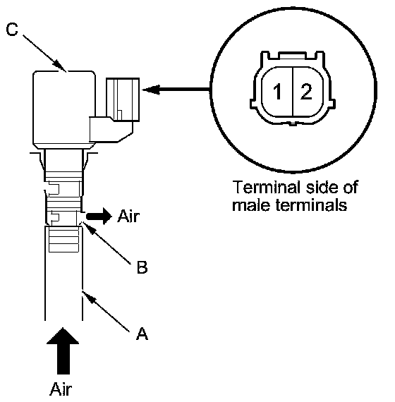 12. Connect a jumper wire from the negative battery terminal to shift solenoid valve C connector terminal No. 1, and connect another jumper wire from the positive battery terminal to connector terminal No. 2. Blow air into the tube.