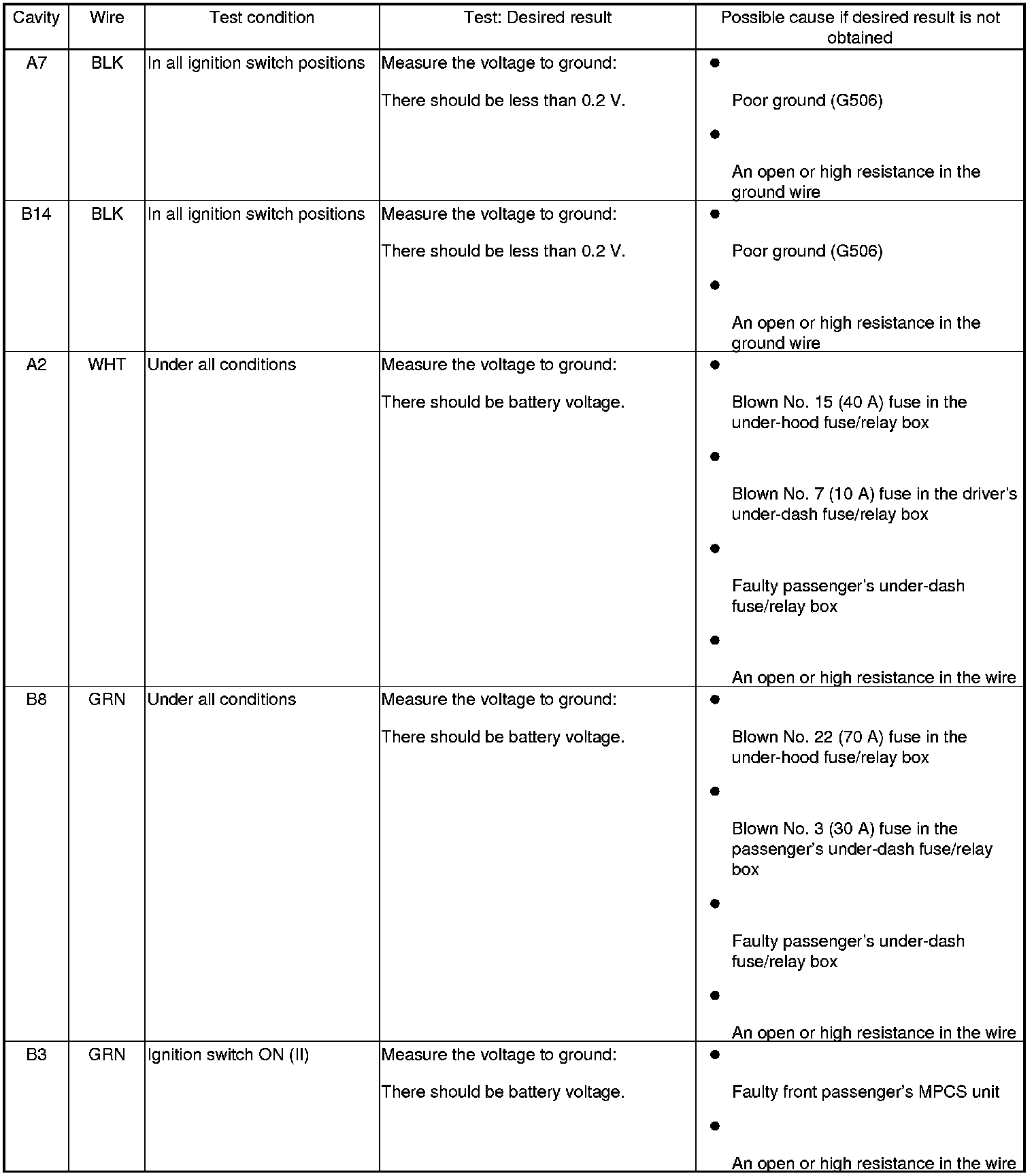 - If all the input tests prove OK, the control unit must be faulty; replace the front passenger's MPCS unit and go to step 7.