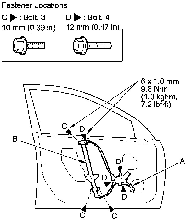 4. Remove the bolts (C), and loosen the bolts (D), then remove the regulator through the hole in the door.