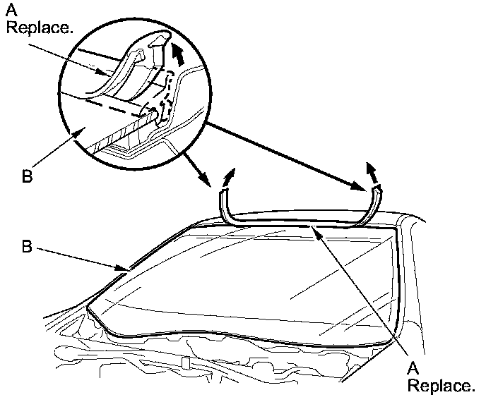 2. Remove the windshield molding (A) from the upper edge of the windshield (B). If necessary, cut the windshield molding with a utility knife.