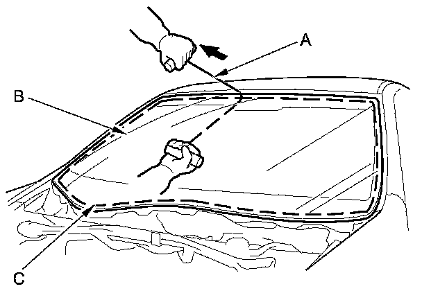6. With a helper on the outside, pull the piano wire (A) back and forth in a sawing motion. Hold the piano wire as close to the windshield (B) as possible to prevent damage to the body and the dashboard. Carefully cut through the rubber dam and the adhesive (C) around the entire windshield.