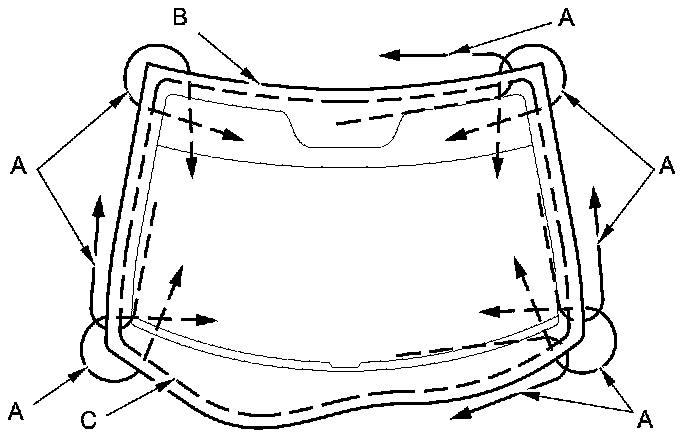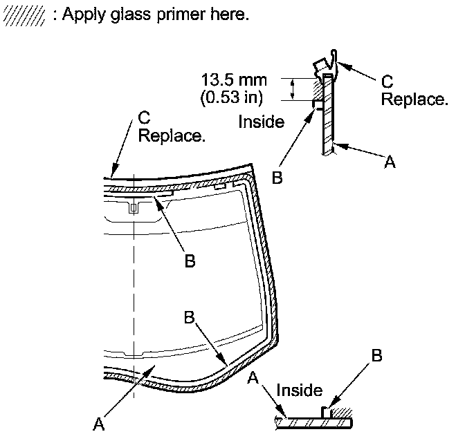 16. Apply a light coat of glass primer to the windshield (A) along the edge of the rubber dams (B) and the windshield molding (C) as shown, then lightly wipe it off with gauze or cheesecloth: