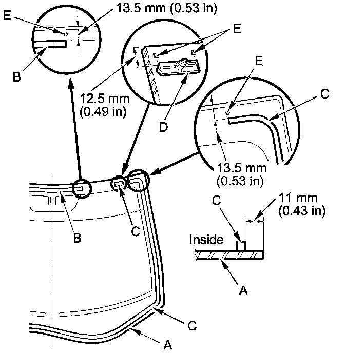 11. Apply glass primer to the upper clip mounting areas on the windshield (A), and let it dry. Remove the adhesive backing, and attach the upper rubber dam (B), the lower rubber dam (C), and the upper clips (D) to the inside face of the windshield as shown: