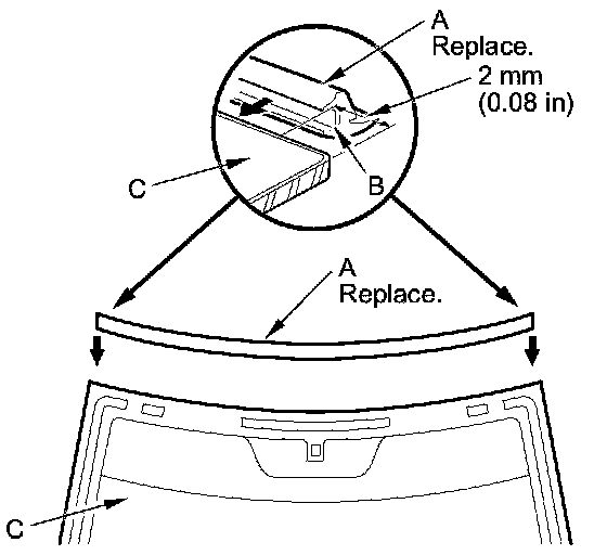 12. Attach the windshield molding (A) with adhesive tape (B) to the upper edge of the windshield (C). Be careful not to touch the windshield where the adhesive will be applied.