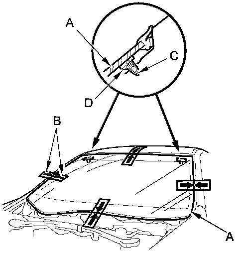 14. If you are installing a new windshield, set the windshield (A) in the opening, and center it. Make alignment marks (B) across the windshield and the body with a grease pencil at the four points shown. Make sure the pin (C) of both upper clips (D) contact with the edge of the body holes. Be careful not to touch the windshield where the adhesive will be applied.