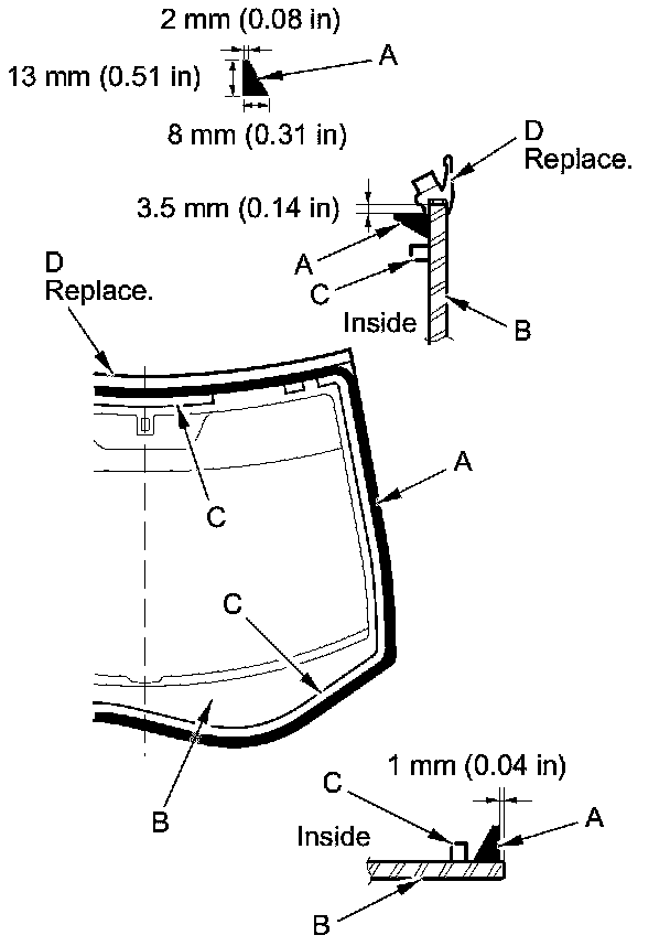 19. Put the cartridge in a caulking gun, and run a continuous bead of the adhesive (A) around the windshield (B) along the edge of the rubber dams (C) and the windshield molding (D) as shown.