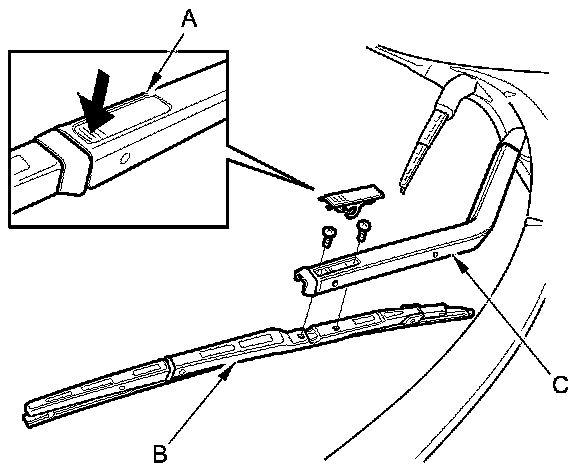 3. Disconnect the blade assembly (B) from the wiper arm (C) by removing the two screws from the arm.