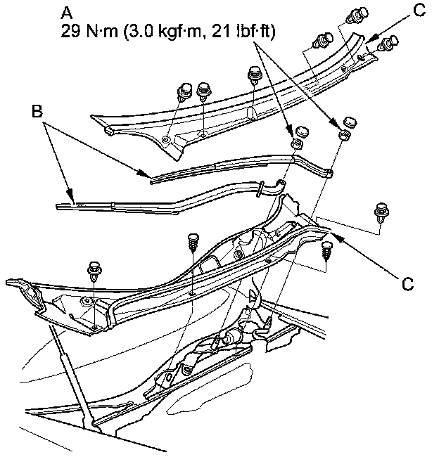 5. Remove the four bolts (B) and wiper linkage assembly (C).