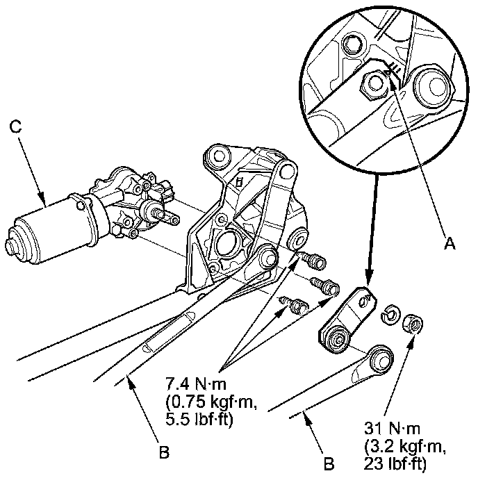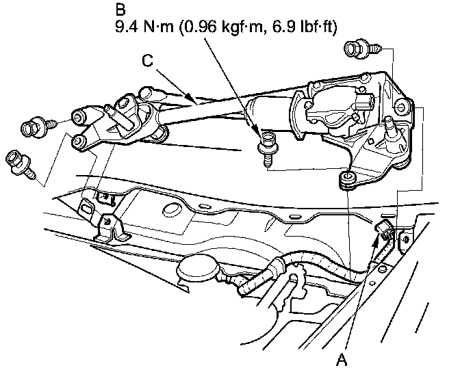 Separate the windshield wiper linkage (B) from the wiper motor (C).