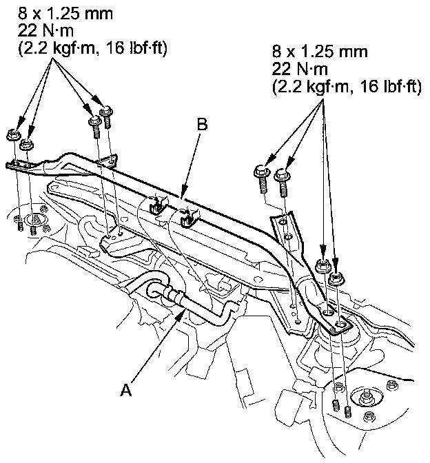 2. Disconnect the brake booster vacuum hose (A) from the strut brace (B).