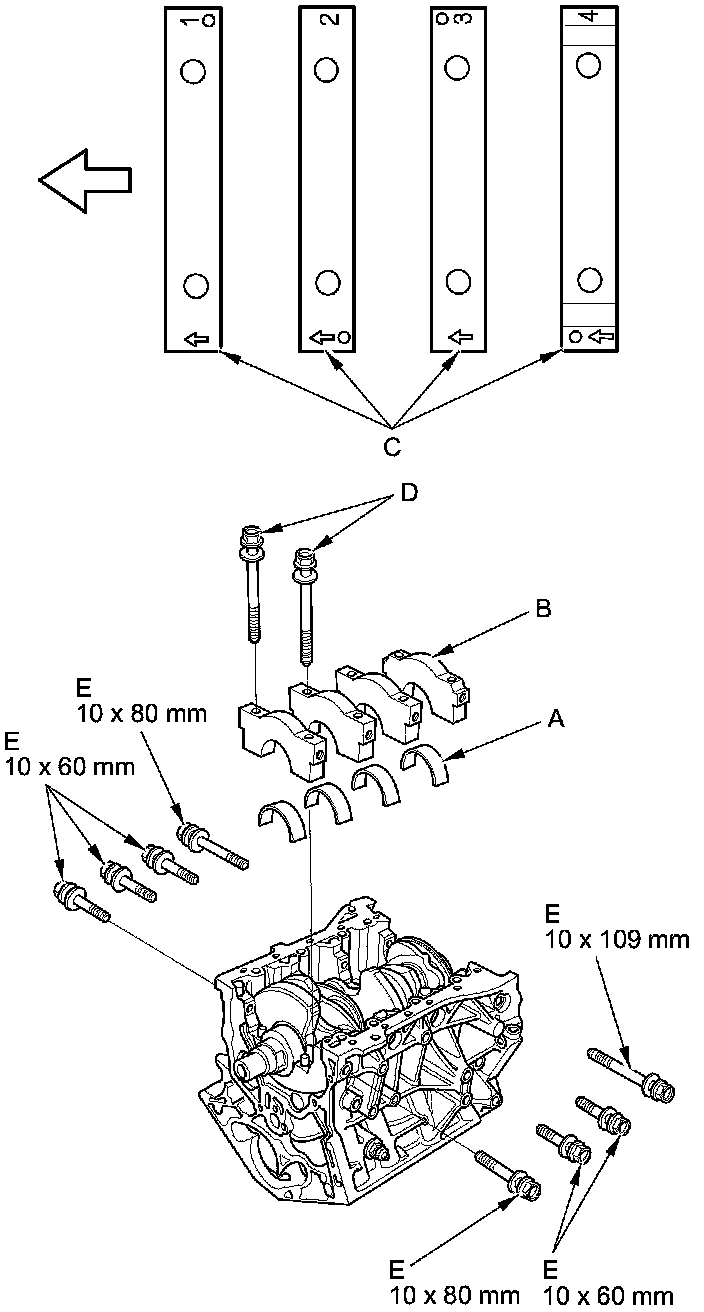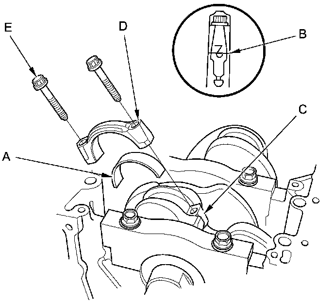 9. Apply new engine oil to the bolt threads and flanges, then loosely install the bearing cap bolts (D) and the bearing cap side bolts (E).