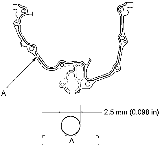 - Apply a 2.5 mm (0.098 in) diameter bead of liquid gasket along the broken line (A).