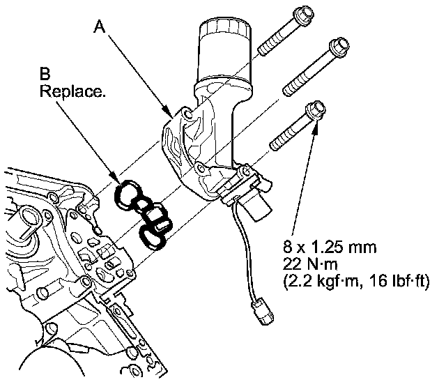 39. Install the rocker arm oil control solenoid/oil filter assembly (A), with a new rocker arm oil control solenoid filter (B).